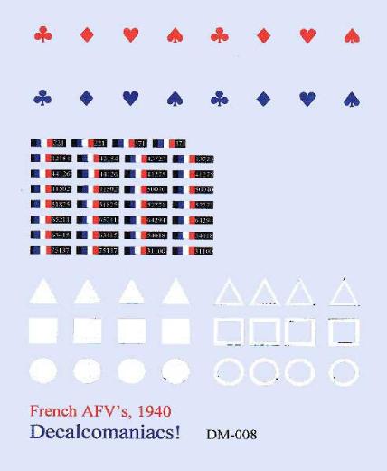 | DM-008, French AFV's, 1940 includes all the markings needed to properly mark all of the Heller kits in proper "Phoney War" markings. The geometric shapes are printed in white, rather than as shown (shown in black for contrast). Price: US$8.00. |